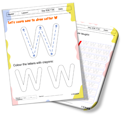First, kids trace lines to practice the fine motor skills they need to form the letter W. Then, they trace the letter several times for practice.